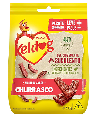 Carne mecanicamente separada de aves, farinha de vísceras de aves, proteína concentrada de soja*, farinha de arroz, farelo de trigo, fécula de mandioca, glicerina derivada de biodiesel de óleo de soja, colágeno, cloreto de sódio (sal comum), açúcar de cana-deaçúcar, ácido fosfórico, corante caramelo IV, sorbato de potássio, aroma natural de fumaça (mín. 0,1%), aroma de churrasco (mín. 0,1%) e antioxidante BHA e BHT. Eventuais substitutivos: miúdos bovinos, fígado de aves, farelo de arroz, hidrolisado de fígado desidratado de aves. Espécies doadoras dos genes transgênicos: Agrobacterium tumefaciens, Arabidopsis thaliana, Bacillus thuringiensis, Streptomyces viridochromogenes.